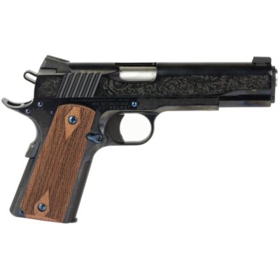 Standard Mfg 1911 Handgun .45 ACP 7rd Magazine 5″ Barrel Black and Royal Blue Engraving with Brown Grips