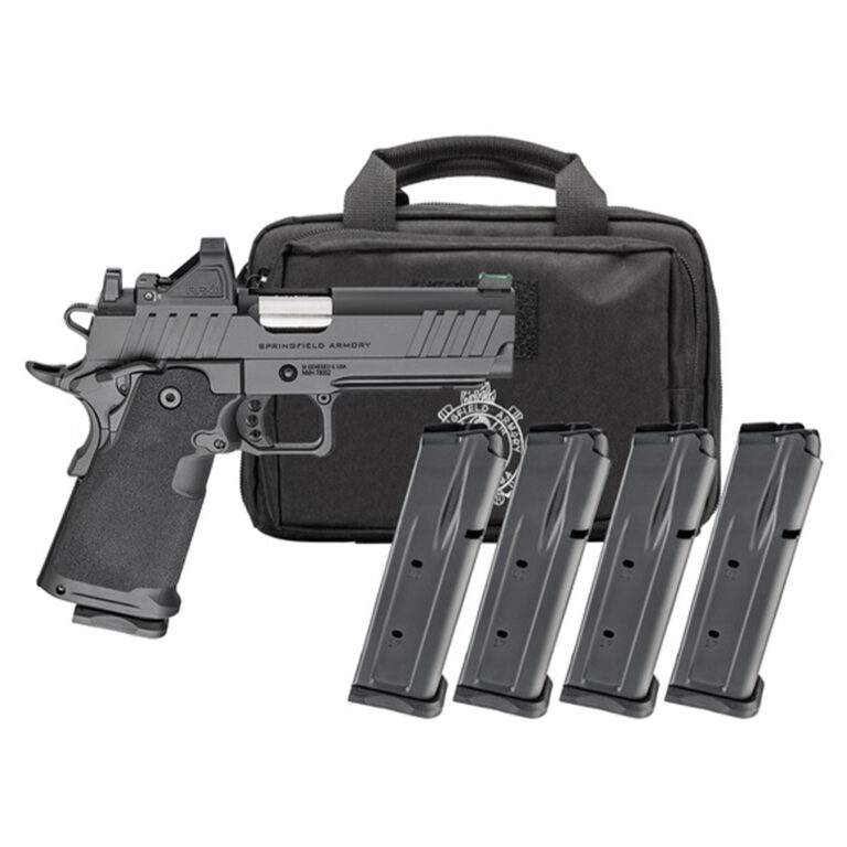 Springfield 1911 DS Prodigy 4.25″ Compact AOS 9mm Tritium Front, Back Serrated Rear Sights; Gear PAC: Viridian RFX11 Green Dot Optic; Premium Pistol Bag; 4x15rd Magazines