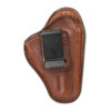 This leather inside the waistband holster meets the requirements for deep concealment applications. The design features a high back that provides a shield between the body and the sharp edges pf the pistol for comfort and to protect clothing. It is designed to ride at the optimum angle inside the waistband to allow for a proper firing grip. The belt clip provides easy on/off convenience and securely anchors the holster to the belt.