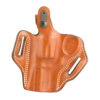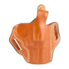 The firearm rides high and is presented at an optimum draw angle. Its thumb break and exact molding, together with a tension device, allows for a secure and highly concealable carry. Belt slots are 1 3/4″ wide. Some models with two belt slots and without tension device.