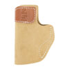 SOF-TUCK(TM) #106 is a new IWB/Tuck-able holster with adjustable cant. It can be worn strong side, cross draw or on the small of the back. It is built from soft, no-slip suede and reinforced at the top with premium saddle leather to aid in re-holstering. The #106 is available for most concealable hand guns in right and left hand.