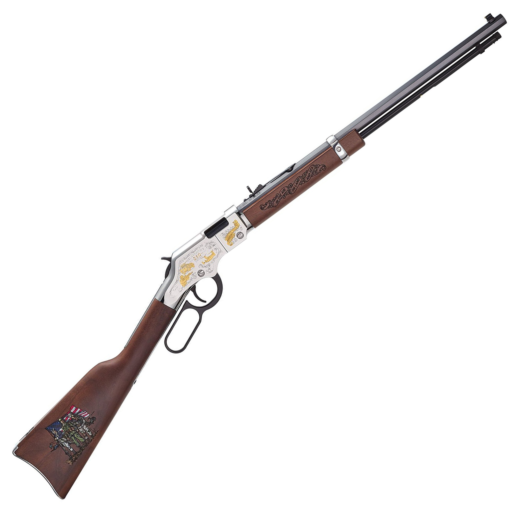 HENRY H4 Spirit of the Corps Tribute 22S/L/LR American Walnut Stock, 1in16 Twist, Octagon Blued Steel Barrel, 16LR/21S Receiver Engraving With 24Kt Gold Plated Highlights, Engraved, Painted Buttstock Engraved Forearm