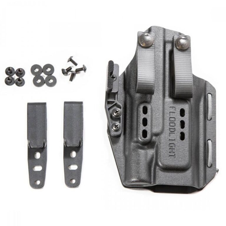 The Floodlight like the Skeleton is ambidextrous and can be worn AIWB or strong-side IWB using either soft loops or clips (included). Reduced lower-profile ergonomic molding improves comfort in a variety of carry positions and provides an ideal attachment point for your choice of aftermarket ergonomic wedge or DIY solution.