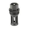 This Quick Detach (QD) flash hider muzzle device will allow a shooter to utilize any of the R556, R556A1, R556A2, R30A1, or R30A2 suppressors on weapons that have 5/8×24 muzzle threads. Featuring a birdcage-style flash hider, a taper mounting surface, and a ratcheting secondary retention system, this QD flash hider muzzle device will ensure precise and repeatable performance from your suppressor. Constructed of heat-treated Chromoly Steel with OXyN gas nitride finish.