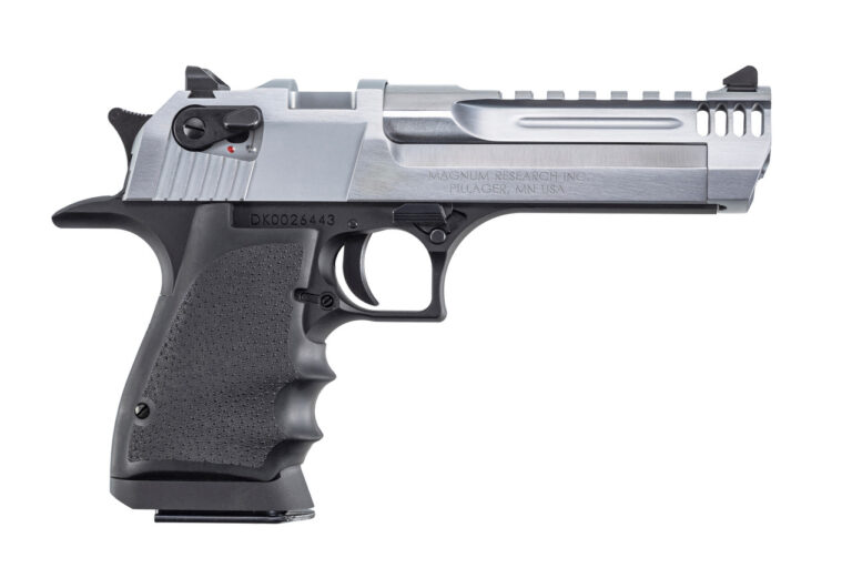 The Desert Eagle L5 Mark XIX features a 5-inch barrel length and hard-coat anodized black aluminum frame, carbon steel slide and barrel, and Hogue finger groove rubber grip. The pistol also has Magnum Research’s widely popular integral muzzle brake. The light-weight Desert Eagle L5 models are New York State compliant.