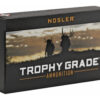 Nosler Trophy Grade ammunition is loaded with the Nosler Partition bullet – the benchmark for hunting bullets since 1948 and the cornerstone upon which the entire company was founded. The bullet’s dual-core design assures rapid expansion of the foremost core while Nosler’s integral partition supports the expanded mushroom allowing the enclosed rear core to remain intact retaining more than two-thirds the original bullet weight for deep penetration. Tried and true, Nosler’s Trophy Grade ammunition provides undeniable reliability on all game.