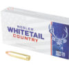 Nosler’s Whitetail Country ammunition, featuring the Straight-Wall bullet, is crafted with decades of hunting expertise and engineered specifically for deer. The Straight-Wall bullet, designed for slower impact velocities common to straight-wall cartridges, utilizes a flat base, thin jacket mouth, and lead nose for reliable expansion at extended range. The bullet’s truncated nose profile ensures smooth feeding in all action types while the precisely form-fitted lead core enhances bullet stability and accuracy, making Whitetail Country ammunition the ideal choice for deer hunters.