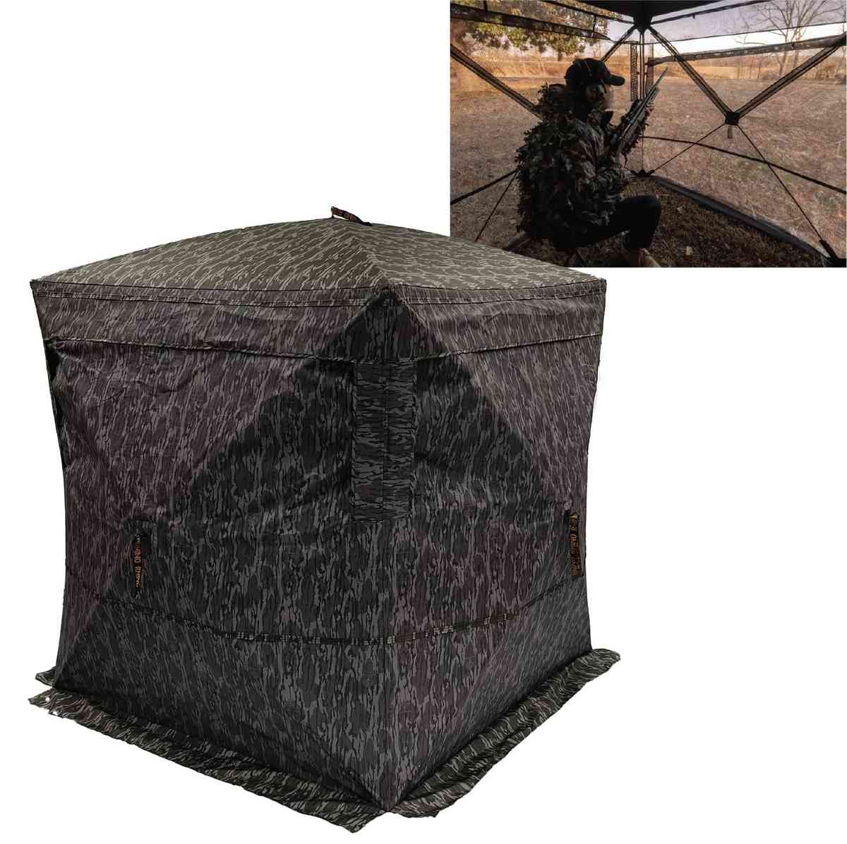 The Rhino 180 See Through blind takes ground blind hunting to a whole new level! This unique 2-way mesh system prevents wild game from seeing in while allowing you the hunter to see out crystal clear without any obstruction. The Rhino 180 blends in seamlessly with almost any environment and can easily have other natural habitat added with the included brush-in straps around the top and bottom of the blind. Like all hub-style Rhino blinds the R180 features an oversized zipper less door. Easily adjust your shooting window with Rhino's "silent-slide" window technology. This blind can comfortably hold up to 3 people and makes setup/take down a breeze. Change the way you see the inside of a ground blind with this R180 from Rhino!