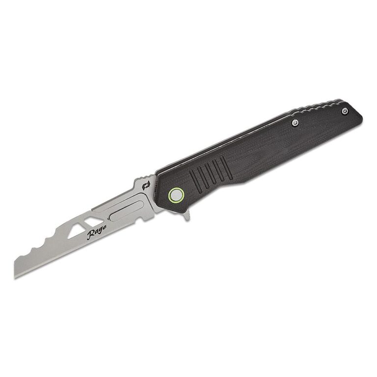 Bringing together one of America's longest-lasting cutlery companies with one of the best-selling hunting broadheads of all time the Schrade Enrage Series provides the best functioning & most useful line of replaceable blade knives. Designed with Rage broadhead technology the Enrage Replacement Blades are razor sharp. The Nitro Enrage 7 features a 2.5" replaceable utility blade and a 4.5" black G10/steel handle for everyday carry. Included with the Nitro Enrage 7 is a dual-sided blade case for blade storage a safe blade removal/installation tool and a tip-down pocket clip for easy carrying. Equipped with an assist spring the blade rockets open with ease and locks into place with the sturdy frame lock ensuring this blade is ready to work when you are.
