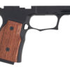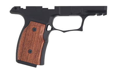 Grip Module for the Sig P365X/XL with Safety. Machined from billet 7075-T6 Aluminum with a black anodized finish. Like other grip modules from Sharps Bros, the grip panels are made from an Brazilian cherry wood. Featuring an enhanced trigger-guard geometry with undercut and finger grooves for improved comfort and control.