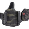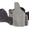 An ergonomic, mission-adjustable, RDS-compatible, multi-positional, deep concealment IWB hybrid thermoplastic holster. Its distinctive features enable concealed carry for a wide range of handgun fits from various carry positions while allowing a full firing grip prior to drawing. The design includes passive retention and adjustable tension, enabling a finely tuned fit and smooth draw. This evolution of the IncogX features a series of clips that provide more adaptability to the user while maintaining the original goals of improved grip, concealment, and function. The clips open outward and slide down with the holster, naturally locking over the belt. An actuated finger tab flexes to open, allowing quick installation or removal from the belt. An improved clip strut design combines functionality with customized concealment shims that can be easily installed or removed without tools. All IncogX models come with clip strut shims in three different concealment sizes: 1/8″, 1/4″, and 3/8″.