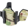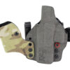 An ergonomic, mission-adjustable, RDS-compatible, multi-positional, deep concealment IWB hybrid thermoplastic holster. Its distinctive features enable concealed carry for a wide range of handgun fits from various carry positions while allowing a full firing grip prior to drawing. The design includes passive retention and adjustable tension, enabling a finely tuned fit and smooth draw. This evolution of the IncogX features a series of clips that provide more adaptability to the user while maintaining the original goals of improved grip, concealment, and function. The clips open outward and slide down with the holster, naturally locking over the belt. An actuated finger tab flexes to open, allowing quick installation or removal from the belt. An improved clip strut design combines functionality with customized concealment shims that can be easily installed or removed without tools. All IncogX models come with clip strut shims in three different concealment sizes: 1/8″, 1/4″, and 3/8″.