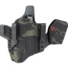 An ergonomic, mission-adjustable, RDS-compatible, multi-positional, deep concealment IWB hybrid thermoplastic holster. Its distinctive features enable concealed carry for a wide range of handgun fits from various carry positions while allowing a full firing grip prior to drawing. The design includes passive retention and adjustable tension, enabling a finely tuned fit and smooth draw. This evolution of the IncogX features a series of clips that provide more adaptability to the user while maintaining the original goals of improved grip, concealment, and function. The clips open outward and slide down with the holster, naturally locking over the belt. An actuated finger tab flexes to open, allowing quick installation or removal from the belt. An improved clip strut design combines functionality with customized concealment shims that can be easily installed or removed without tools. All IncogX models come with clip strut shims in three different concealment sizes: 1/8″, 1/4″, and 3/8″. Compatible with the Following Weapon Lights Streamlight TLR-1, TLR-1HL, TLR-1HL-X Surefire X300, X300U, X300T, Nightstick TCM-850, TWM-30, Holosun PID