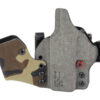 An ergonomic, mission-adjustable, RDS-compatible, multi-positional, deep concealment IWB hybrid thermoplastic holster. Its distinctive features enable concealed carry for a wide range of handgun fits from various carry positions while allowing a full firing grip prior to drawing. The design includes passive retention and adjustable tension, enabling a finely tuned fit and smooth draw. This evolution of the IncogX features a series of clips that provide more adaptability to the user while maintaining the original goals of improved grip, concealment, and function. The clips open outward and slide down with the holster, naturally locking over the belt. An actuated finger tab flexes to open, allowing quick installation or removal from the belt. An improved clip strut design combines functionality with customized concealment shims that can be easily installed or removed without tools. All IncogX models come with clip strut shims in three different concealment sizes: 1/8″, 1/4″, and 3/8″.