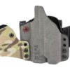 An ergonomic, mission-adjustable, RDS-compatible, multi-positional, deep concealment IWB hybrid thermoplastic holster. Its distinctive features enable concealed carry for a wide range of handgun fits from various carry positions while allowing a full firing grip prior to drawing. The design includes passive retention and adjustable tension, enabling a finely tuned fit and smooth draw. This evolution of the IncogX features a series of clips that provide more adaptability to the user while maintaining the original goals of improved grip, concealment, and function. The clips open outward and slide down with the holster, naturally locking over the belt. An actuated finger tab flexes to open, allowing quick installation or removal from the belt. An improved clip strut design combines functionality with customized concealment shims that can be easily installed or removed without tools. All IncogX models come with clip strut shims in three different concealment sizes: 1/8″, 1/4″, and 3/8″.