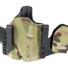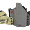 An ergonomic, mission-adjustable, RDS-compatible, multi-positional, deep concealment IWB hybrid thermoplastic holster. Its distinctive features enable concealed carry for a wide range of handgun fits from various carry positions while allowing a full firing grip prior to drawing. The design includes passive retention and adjustable tension, enabling a finely tuned fit and smooth draw. This evolution of the IncogX features a series of clips that provide more adaptability to the user while maintaining the original goals of improved grip, concealment, and function. The clips open outward and slide down with the holster, naturally locking over the belt. An actuated finger tab flexes to open, allowing quick installation or removal from the belt. An improved clip strut design combines functionality with customized concealment shims that can be easily installed or removed without tools. All IncogX models come with clip strut shims in three different concealment sizes: 1/8″, 1/4″, and 3/8″.