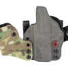 An ergonomic, mission-adjustable, RDS-compatible, multi-positional, deep concealment IWB hybrid thermoplastic holster. Its distinctive features enable concealed carry for a wide range of handgun fits from various carry positions while allowing a full firing grip prior to drawing. The design includes passive retention and adjustable tension, enabling a finely tuned fit and smooth draw. This evolution of the IncogX features a series of clips that provide more adaptability to the user while maintaining the original goals of improved grip, concealment, and function. The clips open outward and slide down with the holster, naturally locking over the belt. An actuated finger tab flexes to open, allowing quick installation or removal from the belt. An improved clip strut design combines functionality with customized concealment shims that can be easily installed or removed without tools. All IncogX models come with clip strut shims in three different concealment sizes: 1/8″, 1/4″, and 3/8″.