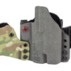 An ergonomic, mission-adjustable, RDS-compatible, multi-positional, deep concealment IWB hybrid thermoplastic holster. Its distinctive features enable concealed carry for a wide range of handgun fits from various carry positions while allowing a full firing grip prior to drawing. The design includes passive retention and adjustable tension, enabling a finely tuned fit and smooth draw. This evolution of the IncogX features a series of clips that provide more adaptability to the user while maintaining the original goals of improved grip, concealment, and function. The clips open outward and slide down with the holster, naturally locking over the belt. An actuated finger tab flexes to open, allowing quick installation or removal from the belt. An improved clip strut design combines functionality with customized concealment shims that can be easily installed or removed without tools. All IncogX models come with clip strut shims in three different concealment sizes: 1/8″, 1/4″, and 3/8″.