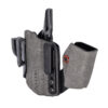The Incog X is compatible with any Red Dot Sight (RDS) capable of being installed on the firearm manufacturer’s slide behind the ejection port (including mounting options using the firearm manufacturer’s adapter plates). They tested dozens of popular RDS models including larger optics like the Trijicon SRO. The Trijicon SRO requires a slight repositioning of the upper flat clip to eliminate minor interference, but works flawlessly after adjustment. The INCOG-X inside the waistband holster for Sig P320 configured for a light and comes with a magazine caddie. Boltaron construction provides form fitting passive retention. Suede exterior adds extra friction for secure IWB wear. Adjustable clip positioning allows for ride-height adjustment.