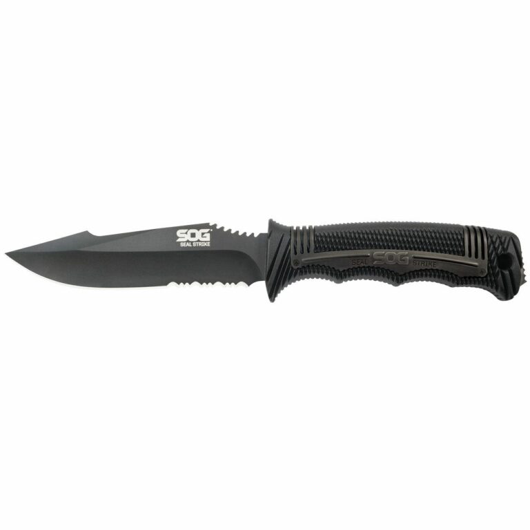 The newest member of the SEAL fixed-blade knife family the SEAL Strike takes everything SOG has learned from years of real-world deployment and combines it into one spectacular package. This quality AUS-8 stainless steel partially serrated blade is an excellent field companion for outdoor and underwater adventures. The SEAL Strike is serious business and carries on the tradition of supplying the world’s elite military forces. It comes with a standard hard nylon sheath or a deluxe model with built-in cord cutter single-stage sharpener fire starter and larger attachment points. Be at the ready with the fully capable SEAL Strike.