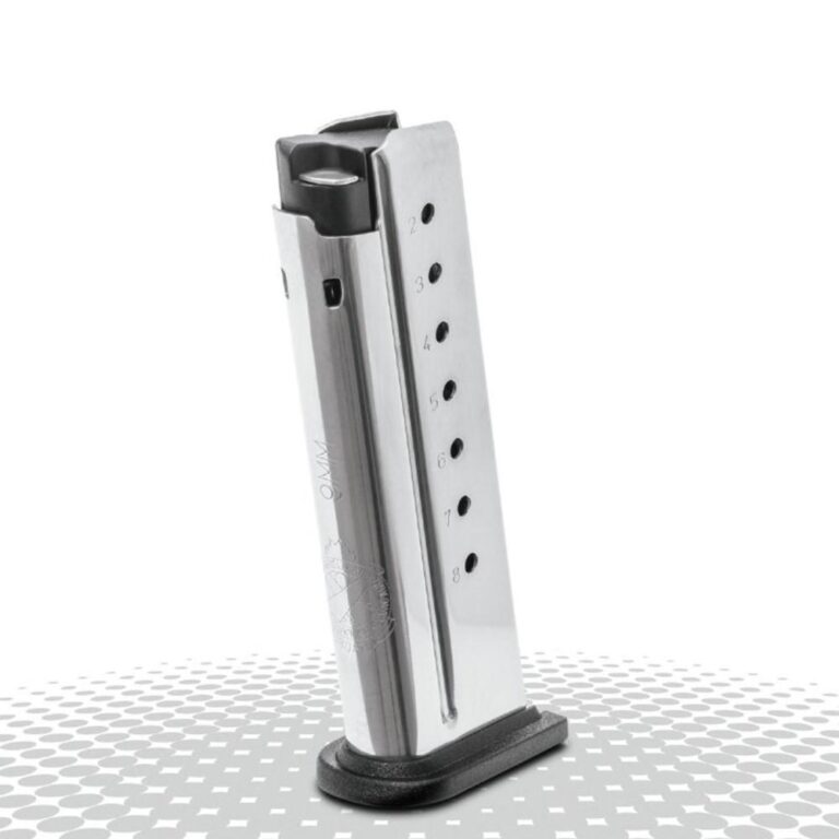 Designed to fit Springfield Armory XD-E model pistols chambered in 9mm this nickel plated steel magazine features a black polymer floorplate and engraved Springfield Armory emblem.