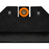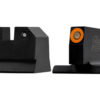 XS R3D Night Sights feature a traditional 3-dot tritium, notch and post sight picture. The blacked out rear increases contrast against the front sight. Available in orange or green, the front sight ring is equipped with their Ember Glow Dot Technology which absorbs ambient light and glows in low light. R3D sights are the brightest options for fast and accurate shooting in bright and low light. Green is the best option for low light and has the brightest glow intensity. Orange contrasts the best in bright light settings while still maintains visibility in low light. The front sight tritium lamp is brighter than the 2 rear sight lamps, reducing the possibility of mixing up the front sight tritium vial with a rear sight vial in low/no light. The front blade measures 0.145″ (3.68 mm) wide, and the rear notch is 0.170″ (4.32 mm) wide, which increases the visibility of the front sight. R3D sights are installable by sight pusher tools or by using a hammer and punch. Fits HK VP9 Optic Ready. Suppressor Height and lower third co-witnesses with Glock factory cut and RMR.